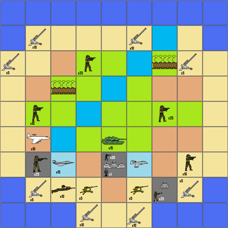 Here's My Map SCENARIO: Nation A has kidnapped Nation B's political leader and taken him to the Nation A' s capitol. The nation was put on High Alert and as such, Nation A's military is placed all over the map. Nation B's objective is to recapture their political leader before he is executed. TIME LIMIT: Nation A can only execute Nation B's political leader after 6 consecutive turns. TO WIN - Nation A: drive back all of Nation B's opposing forces or obtain a treaty from them. TO WIN - Nation B: find and regain your political leader, who may be moved by Nation A around the map, and take the Sector Capitol Building under your control. You have six turns. Nation B's Units: All units pre-set on the game map are for Nation A. Nation B may take as many units as he can fill up in 4 ships, and may also take 2 aircraft of any kind. |