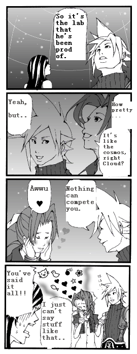 Alantie: Barret says "Huh??!" in that fan-comic. This fan-artist is just too funny, I got some more from her website(JP) and tried to translate them: YOU DID IT!->Pu-hahah!! Barret = <333 Clerith Barrifa!! All fan-comics I posted here belongs to Soru-san's website.