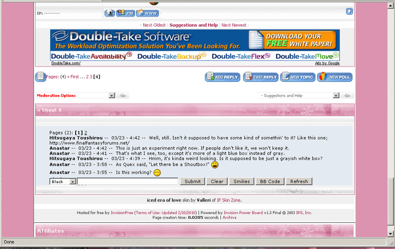 Okay, Quex found a shoutbox for us to use. It's at the bottom of the page, so try it out! ![]() This is *not* permanent yet. I wanna see how people like it first. If there's any problems with it, please let us know! In the meantime, enjoy! And many thanks to Quex!
