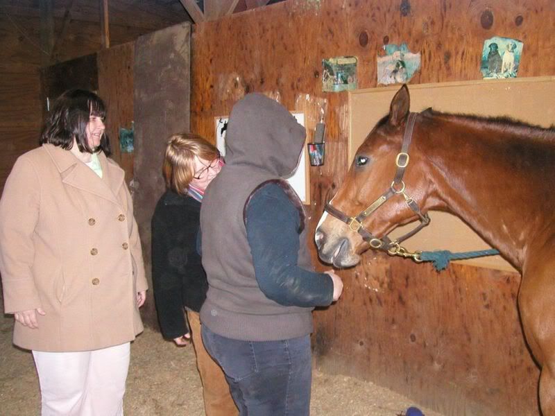 As most of y'all know, there's a big huge disconnect between my horsey life and my musical life. Today my two worlds collided with results that were vastly more entertaining than I would have expected. 3 of my dear friends in the Athens Rawk Chicks clique made the trek out to darkest Redneckville through the freezing rain to meet Avery for the first time. None of them had been anywhere NEAR a horse since their teens! :lol: So here's a photo blog... CHAPTER ONE: Carol, wardrobe mistress to the stars, meets Avery for the first time. Neither one of them is totally convinced this is the best idea in the world. Upon advice, Carol digs for a cookie... ...And everybody decides this might be fun after all. :lol: Avery, singer Vanessa, rockcrit/garage punk podcaster Grrtch, and V's daughter V engage in an in-depth discussion of the relative merits of Roddy Woomble's "My Secret Is My Silence" vis-a-vis Richard Thompson's "The Angels Have Taken My Race Horse Away". "Avery!! Whaddaya MEAN, you don't like The Reigning Sound??!" "Oh. You like Mary Weiss of the Shangri-Las? OK, we can be friends then." ...At which point, the weather was so horrible that the party adjourned to the nearest coffee house for further discussion. THE END. |
