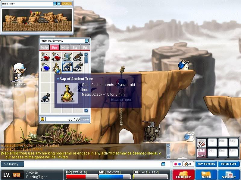 Yeah... Well, both my Archer and my thief have more MP than your Fighter. >_> I found three drops yesterday, but I only made a screen of two of them because I only pressed "Print Screen" instead of Scroll Lock, and accidentally sold the drop before I could take a screen. <_< It was a mallet... I could have kept it for when I ran out of crossbow bolts... But meh. http://img.photobucket.com/albums/v24/IrocZ500/Maple0016.jpg - I get these all the time. http://img.photobucket.com/albums/v24/IrocZ500/Maple0017.jpg - Oooh... Shiny. I later on sold it to a Mage for 1.5k |