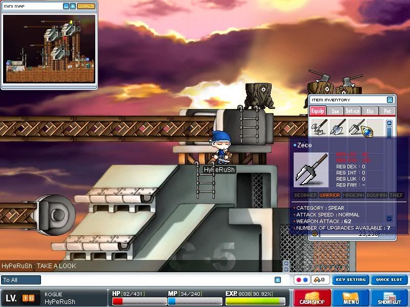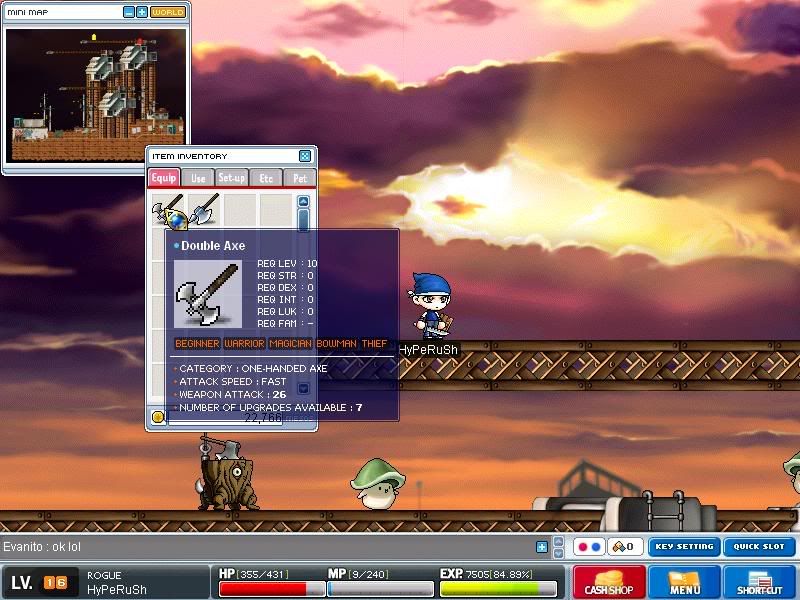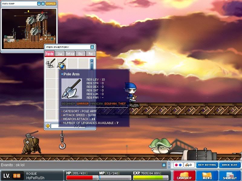 http://img.photobucket.com/albums/v24/IrocZ500/Maple0019.jpg Cool.. An axe.. >_> http://img.photobucket.com/albums/v24/IrocZ500/Maple0020.jpg I got a pole arm when my warrior was level ~15, and I realized how powerful they were. Of course, my Theif had a better weapon at the time. http://img.photobucket.com/albums/v24/IrocZ500/Maple0021.jpg O_O I'm going to make a killing off of this |